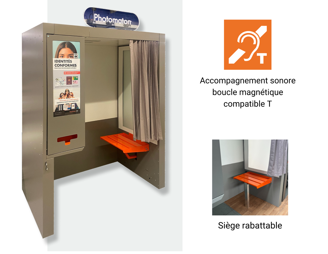 Une cabine conçue autour de l’accessibilité pour permettre aux personnes à mobilité réduite d’effectuer des démarches officielles. Compatible avec le service e-Photo.